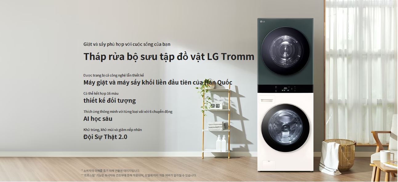 Giặt và sấy phù hợp với cuộc sống của bạn Tháp rửa bộ sưu tập đồ vật LG Tromm được trang bị cả công nghệ lẫn thiết kế. Máy giặt và máy sấy khối liền đầu tiên của Hàn Quốc
