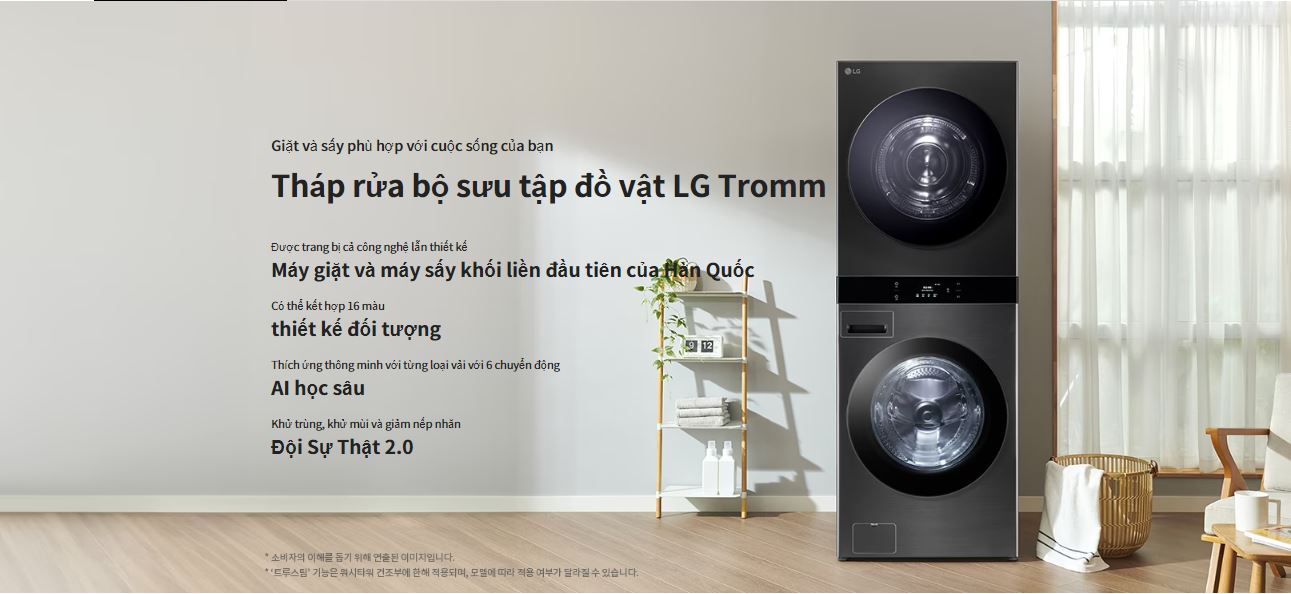 Giặt và sấy phù hợp với cuộc sống của bạn Tháp rửa bộ sưu tập đồ vật LG Tromm được trang bị cả công nghệ lẫn thiết kế. Máy giặt và máy sấy khối liền đầu tiên của Hàn Quốc