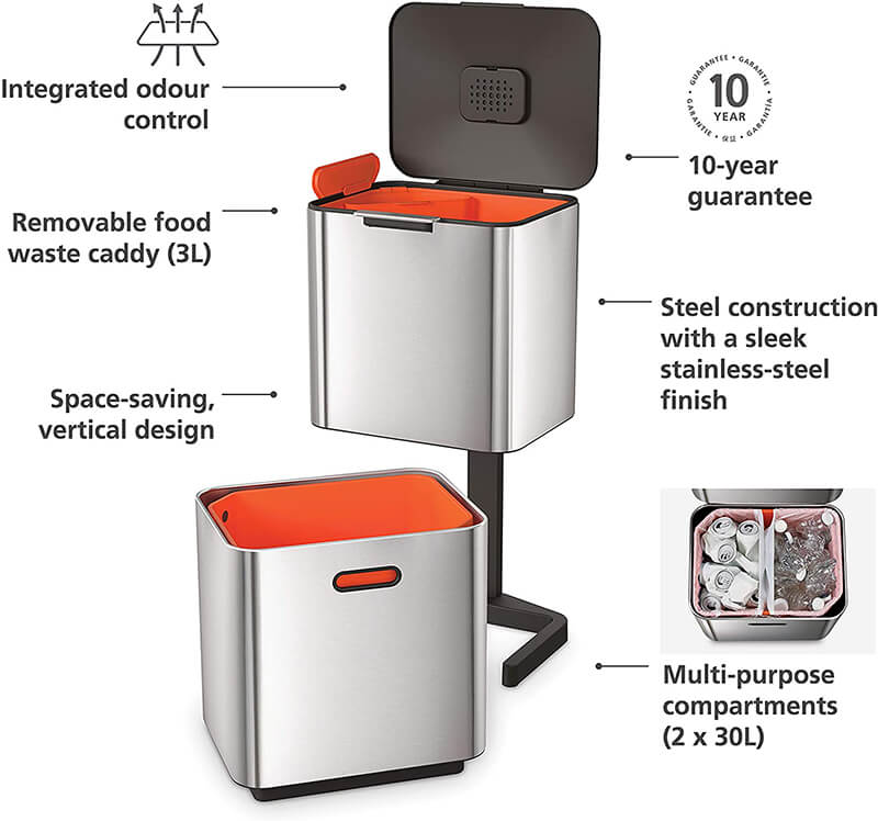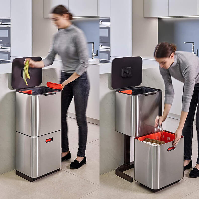 Thùng rác từng đoạt giải thưởng này có các ngăn khác nhau cho rác thải thực phẩm, rác thải thông thường và rác tái chế để bạn có thể dễ dàng phân loại rác chỉ với một bộ phận nhỏ gọn.