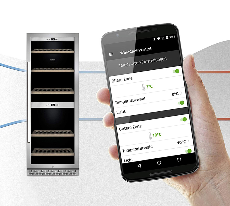 Tủ Bảo Quản Rượu Vang CASO WineChef Pro 126-2D với hai vùng nhiệt độ được điều chỉnh riêng biệt. Do đó lý tưởng để lưu trữ rượu vang trắng và đỏ cùng một lúc, chẳng hạn như rượu sủi tăm, nước chanh hoặc nước cũng có thể được lưu trữ trong Tủ rượu Caso 2 tầng cao cấp