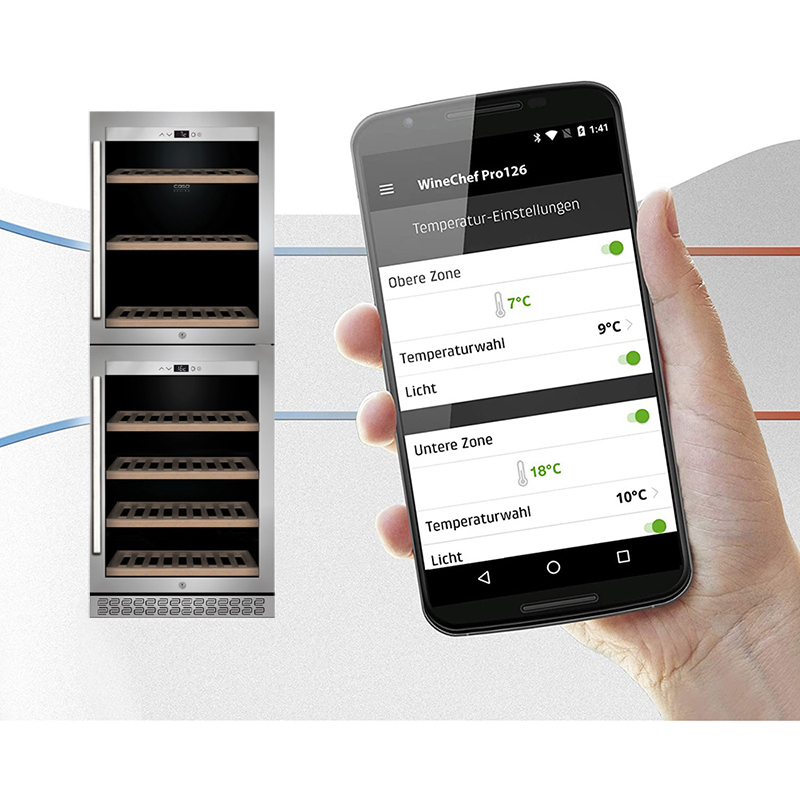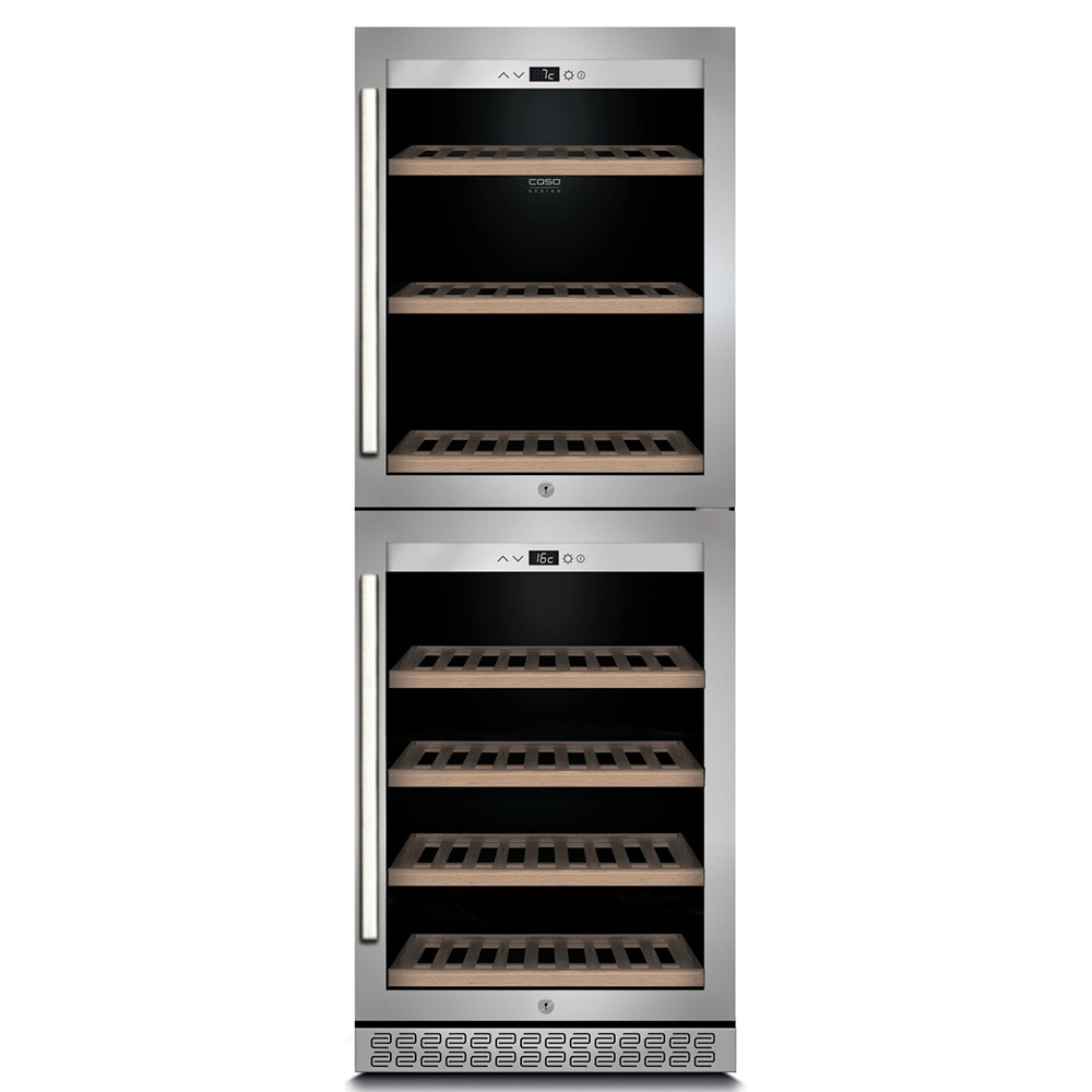 Tủ Bảo Quản Rượu Vang CASO WineChef Pro 126-2D với hai vùng nhiệt độ được điều chỉnh riêng biệt. Do đó lý tưởng để lưu trữ rượu vang trắng và đỏ cùng một lúc, chẳng hạn như rượu sủi tăm, nước chanh hoặc nước cũng có thể được lưu trữ trong Tủ rượu Caso 2 tầng cao cấp