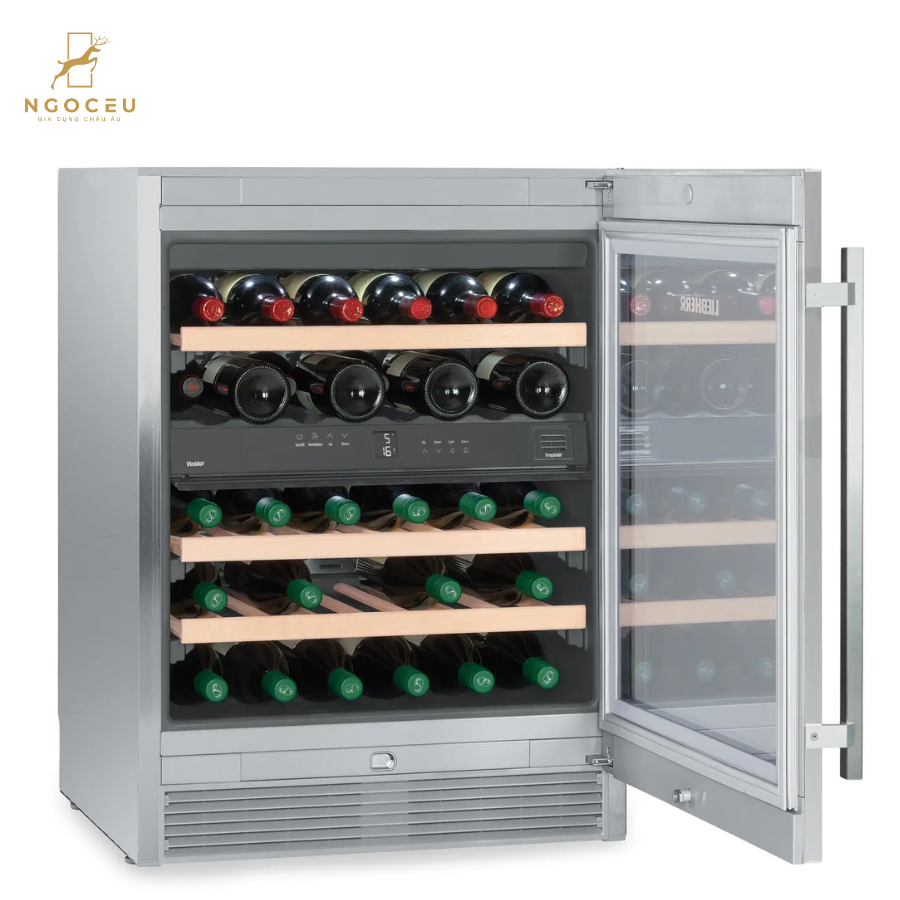 - Hệ thống các khay kệ của tủ : Tủ bảo quản rượu vang mini Liebherr UWTes 1672 Vinidor có dung tích 94 L có sức chứa đến 34 chai Bordeaux tối đa 0,75 L. Thiết kế 5 kệ với 3 kệ được làm từ vật liệu gỗ sồi mộc mạc mà bền chắc, có thể tùy chỉnh chiều cao để sắp đặt các chai rượu thuận lợi, vừa vặn.