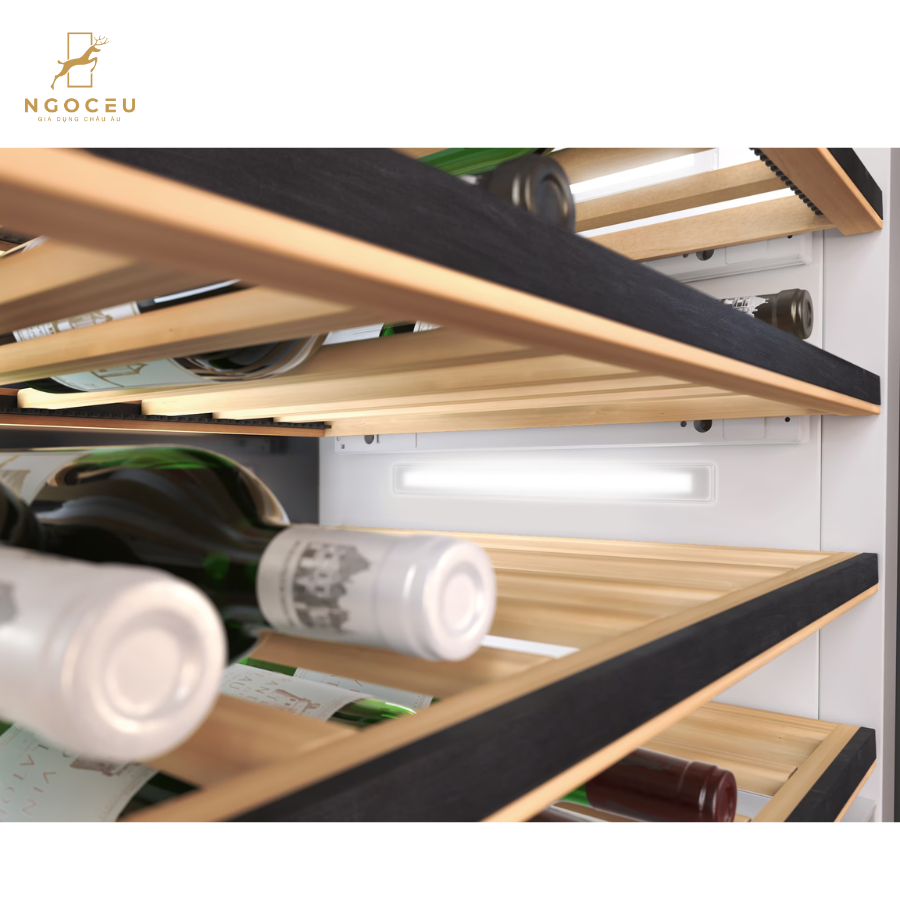 - BrilliantLight – ánh sáng LED tràn ngập không gian: Hệ thống đèn LED cao cấp chiếu sáng đồng đều toàn bộ nội thất bên trong tủ. Điều này không chỉ giúp bạn dễ dàng quan sát và lựa chọn rượu mà còn tạo nên một điểm nhấn sang trọng cho không gian bếp.