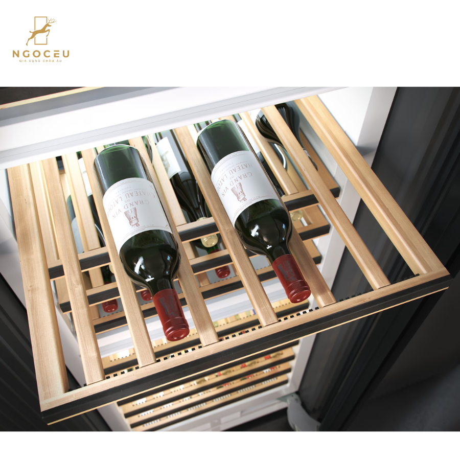 - FlexiFrame – linh hoạt với mọi kích cỡ chai: Hệ thống kệ FlexiFrame cho phép thay đổi vị trí các nan gỗ để cố định chắc chắn cả những chai rượu lớn. Tính năng này mang lại sự linh hoạt tối đa, đặc biệt hữu ích cho những bộ sưu tập rượu đa dạng.