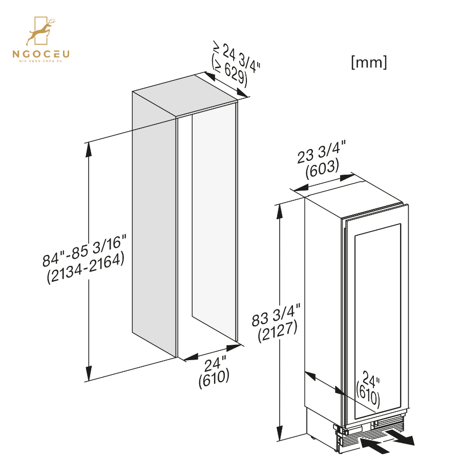 - Kích thước ngách lắp đặt (mm): Rộng: 610–613, Cao: 2134–2164, Sâu: 629