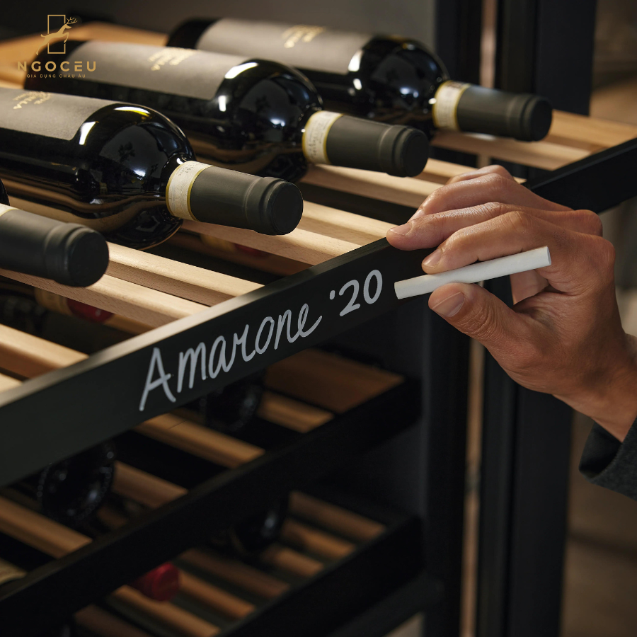 Mỗi khay gỗ được gắn một thanh ghi chú, bạn có thể ghi chú bằng phấn hoặc bút phấn để có cái nhìn tổng quan tốt nhất: Ghi chú về nguồn gốc, loại nho hoặc năm sản xuất của chai rượu của bạn. Các bảng ghi chú có thể được tháo ra để ghi chú một cách thuận tiện.