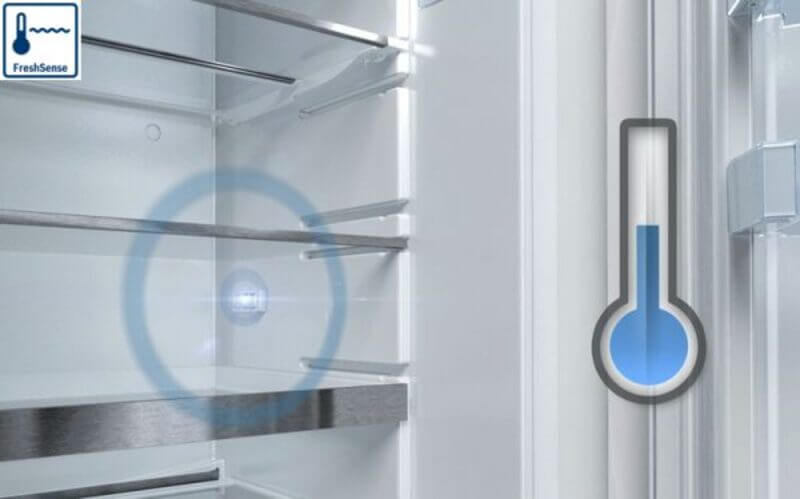 - Nhờ cảm biến nhiệt độ FreshSense trên tủ lạnh Bosch KFN96PX91I giúp tối ưu hóa nhiệt độ bên trong tủ lạnh. Nhiệt độ trong tủ sẽ không ảnh hưởng bởi nhiệt độ bên ngoài.