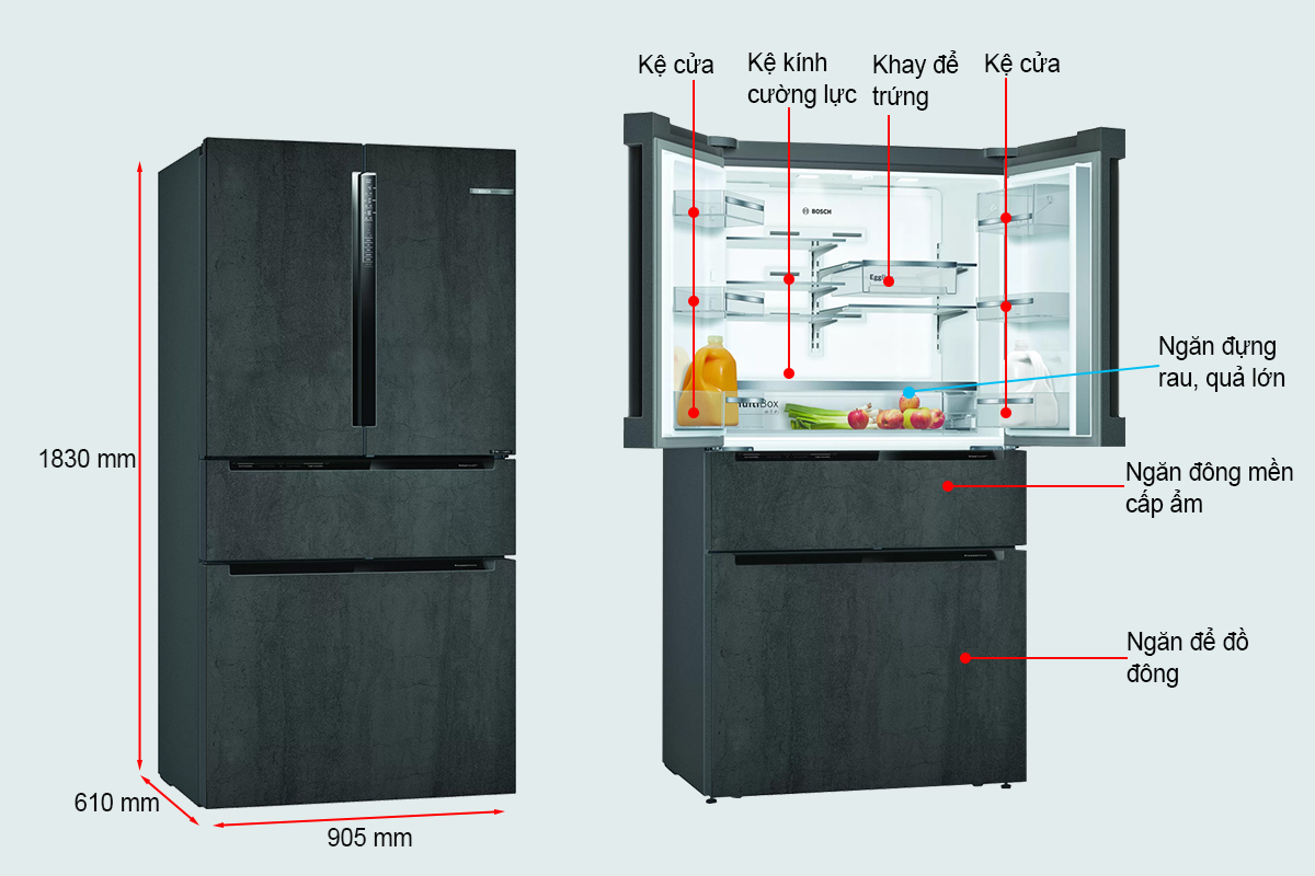 + Kích thước tủ lạnh (CXRxS): 1830 mm x 906 mm x 736 mm
