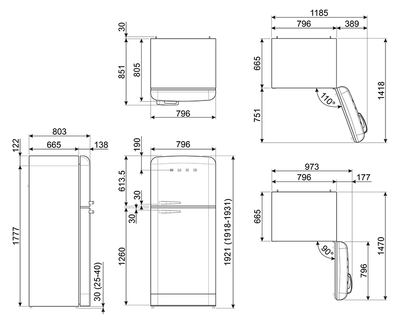– Chiều sâu sản phẩm với cửa mở 90°: 1470 mm