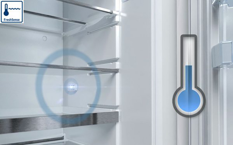 Nhờ cảm biến nhiệt độ FreshSense trên tủ lạnh Bosch KAD90VB20 giúp tối ưu hóa nhiệt độ bên trong tủ lạnh. Nhiệt độ trong tủ sẽ không ảnh hưởng bởi nhiệt độ bên ngoài.