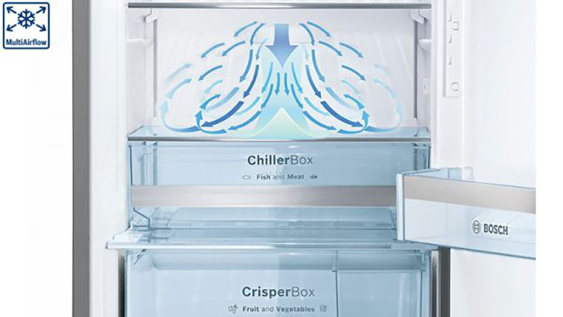 Với hệ thống khí lạnh đa chiều giúp khi lạnh được phân phối đều trên các tầng, khay của ngăn lạnh và ngăn đông qua đó làm giảm sự chêch lệch thay đổi nhiệt độ giữa các vùng. Việc này giúp giảm thời gian làm lạnh, thực phẩm sẽ được lưu trữ lâu hơn