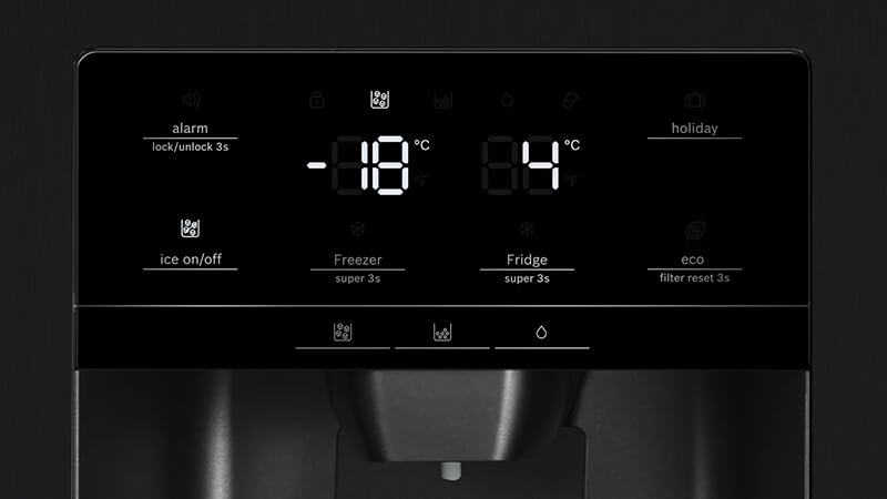 Tủ lạnh Bosch KAD93VBFP với công nghệ lấy đá ngoài tiện lợi, bạn có thể lấy đá xay, đá viên và nước lạnh tự động chỉ với 1 nút nhấn