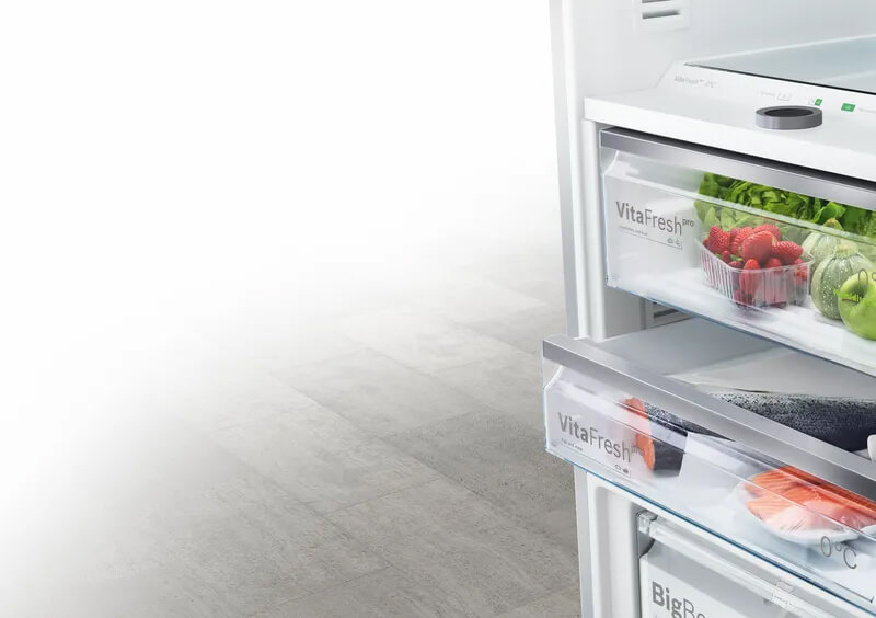 - Sống lành mạnh chưa bao giờ dễ dàng như vậy. Hệ thống làm tươi VitaFresh pro tạo điều kiện bảo quản tốt nhất cho tất cả thực phẩm tươi sống của bạn nhờ công nghệ 0 ° C và mức độ ẩm tối ưu. Ngăn dưới cùng là nơi lý tưởng để lưu trữ cá và thịt, trong khi ngăn trên lớn có thể điều chỉnh vùng ẩm được thiết kế đặc biệt cho trái cây và rau quả. Mức độ ẩm của nó có thể được điều chỉnh trực quan bằng cách sử dụng vòng điều khiển độ ẩm giữa ba cài đặt cho trái cây, rau quả hoặc các chất hỗn hợp để bảo quản vitamin và khoáng chất một cách hoàn hảo. Vì vậy, trái cây và rau củ của bạn giữ được vitamin và tươi lâu hơn. Và nhờ các đường ray có thể mở rộng hoàn toàn, bạn có toàn quyền truy cập vào thực phẩm tươi sống của mình.