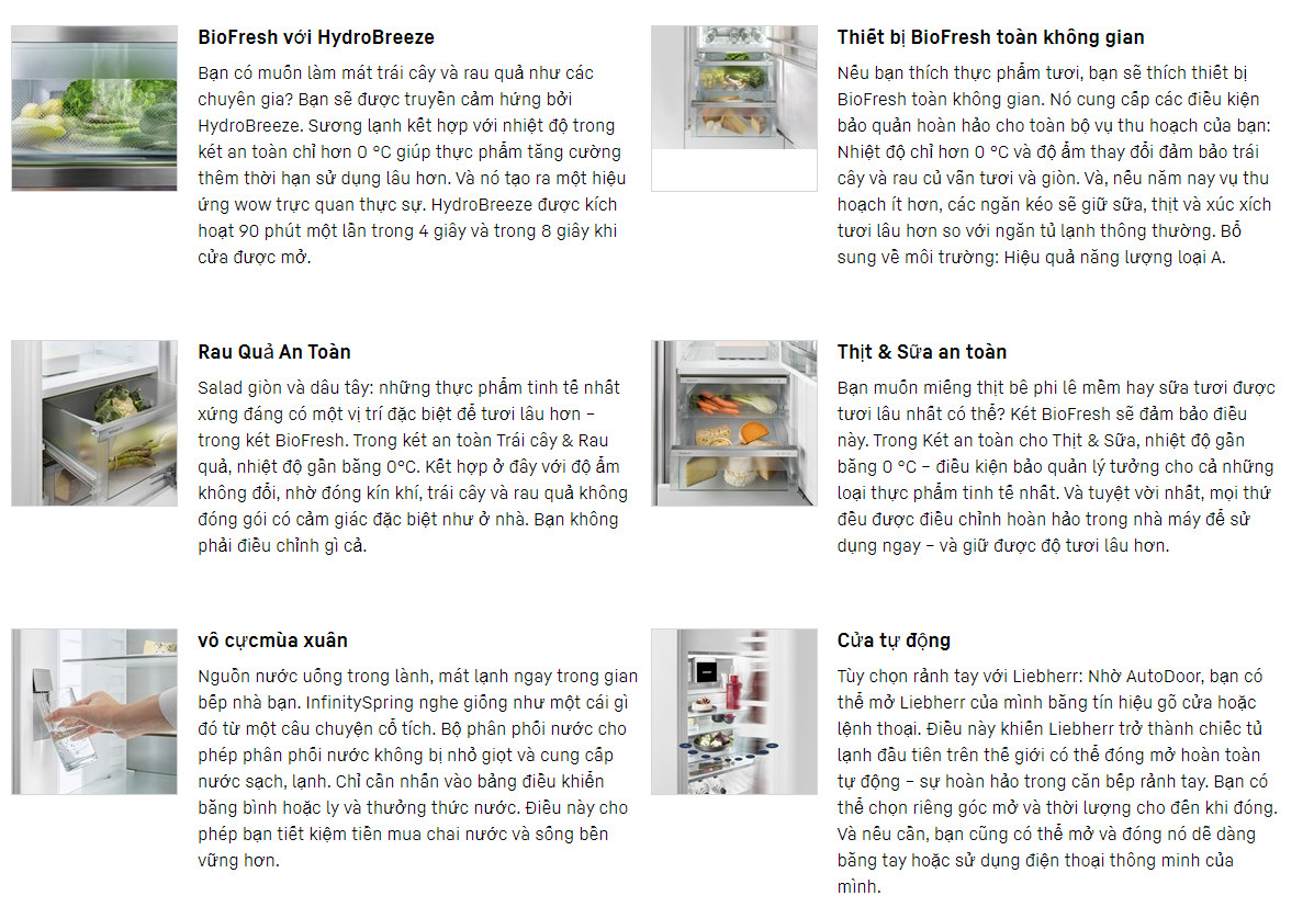 - Vùng khí hậu ngăn tủ lạnh: BioFresh với HydroBreeze / Trái cây & Rau an toàn / Thịt & Sữa an toàn