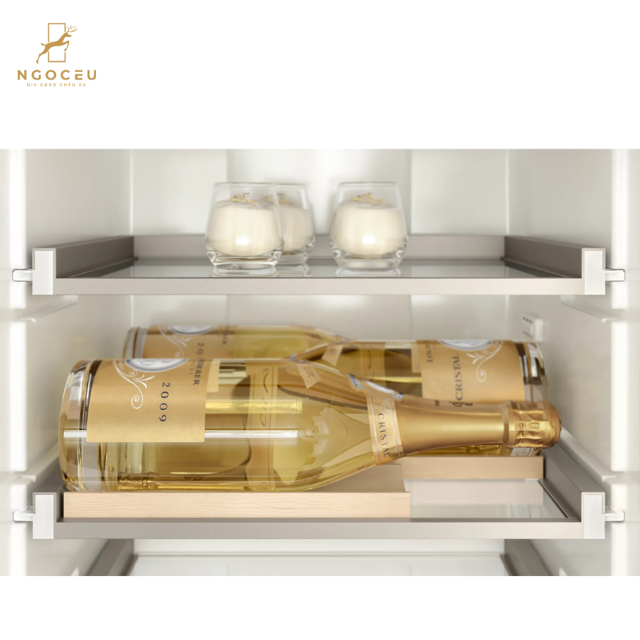- Kệ đựng chai bằng gỗ phong nguyên khối: Thiết kế sang trọng, kệ gỗ có kết nối từ tính giúp cố định chắc chắn bên trong tủ mà vẫn linh hoạt di chuyển. Đây là chi tiết thể hiện đẳng cấp thủ công và phong cách sống tinh tế của Gaggenau.