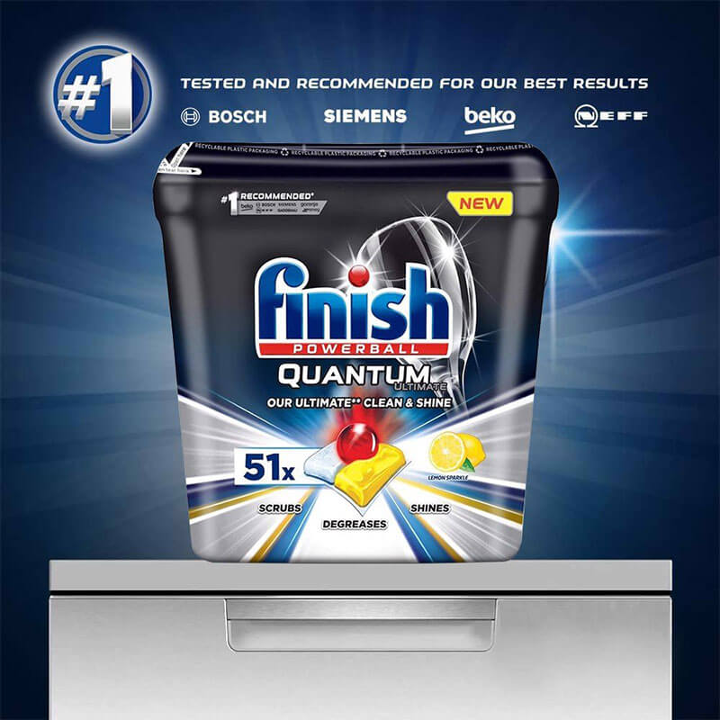 Quantum là dòng cao cấp, hiệu quả nhất và đắt tiền nhất trong dòng sản phẩm viên rửa bát của hãng Finish vì tổng hợp cả 3 thành phần trong 1 viên rửa: làm sạch mỡ, muối chống cặn bám và chất làm bóng đồ sứ và thuỷ tinh Rất tiện dụng nhờ vào màng bọc có thể hòa tan trong nước nên chỉ việc cho viên rửa vào vị trí mà không cần phải bóc lớp màng Sản phẩm được các hãng sản xuất máy rửa bát danh tiếng khuyên dùng, dễ dàng loại bỏ ngay cả những vết bẩn cứng đầu nhất. Viên rửa bát Finish Quantum với đầy đủ chức năng kể cả làm bóng và tạo muối cân bằng nước cứng. Viên rửa bát Finish Quantum được các hãng máy rửa bát danh tiếng giới thiệu như Bosch, Siemens, LG…