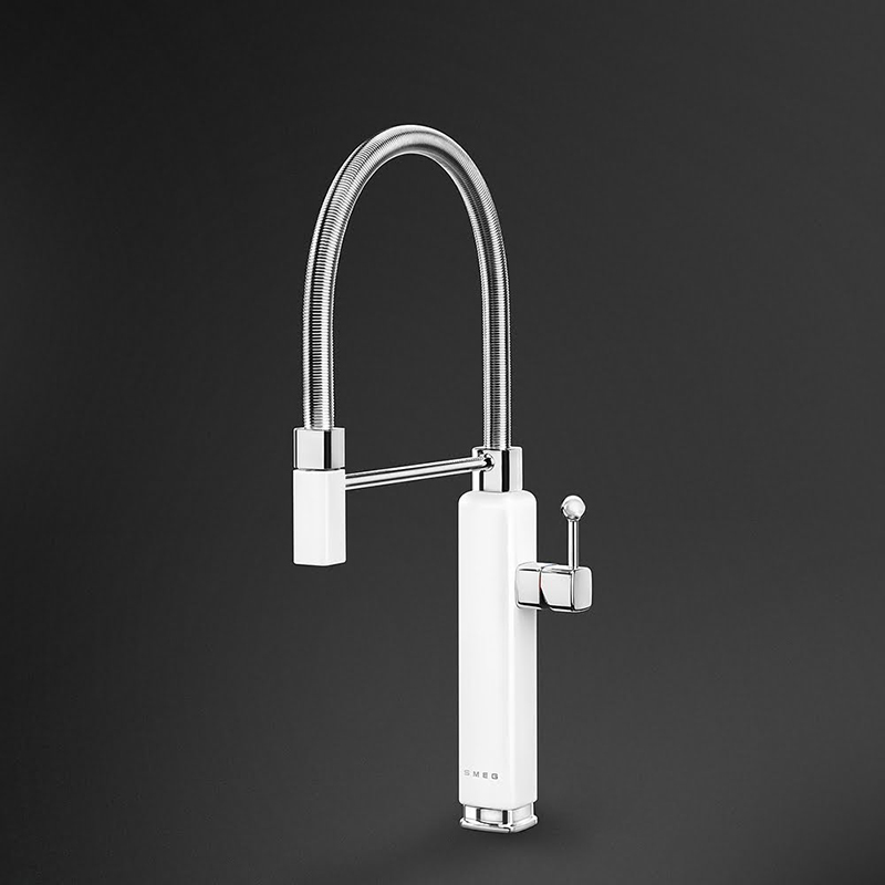 Vòi sen tay cao cổ Smeg MDF50WH, một cần gạt,thiết kế Smeg 50. Phần thân của vòi trang nhã này phản chiếu những đường cong mềm mại đã làm cho chiếc tủ lạnh FAB Smeg mang tính biểu tượng trở nên nổi tiếng.