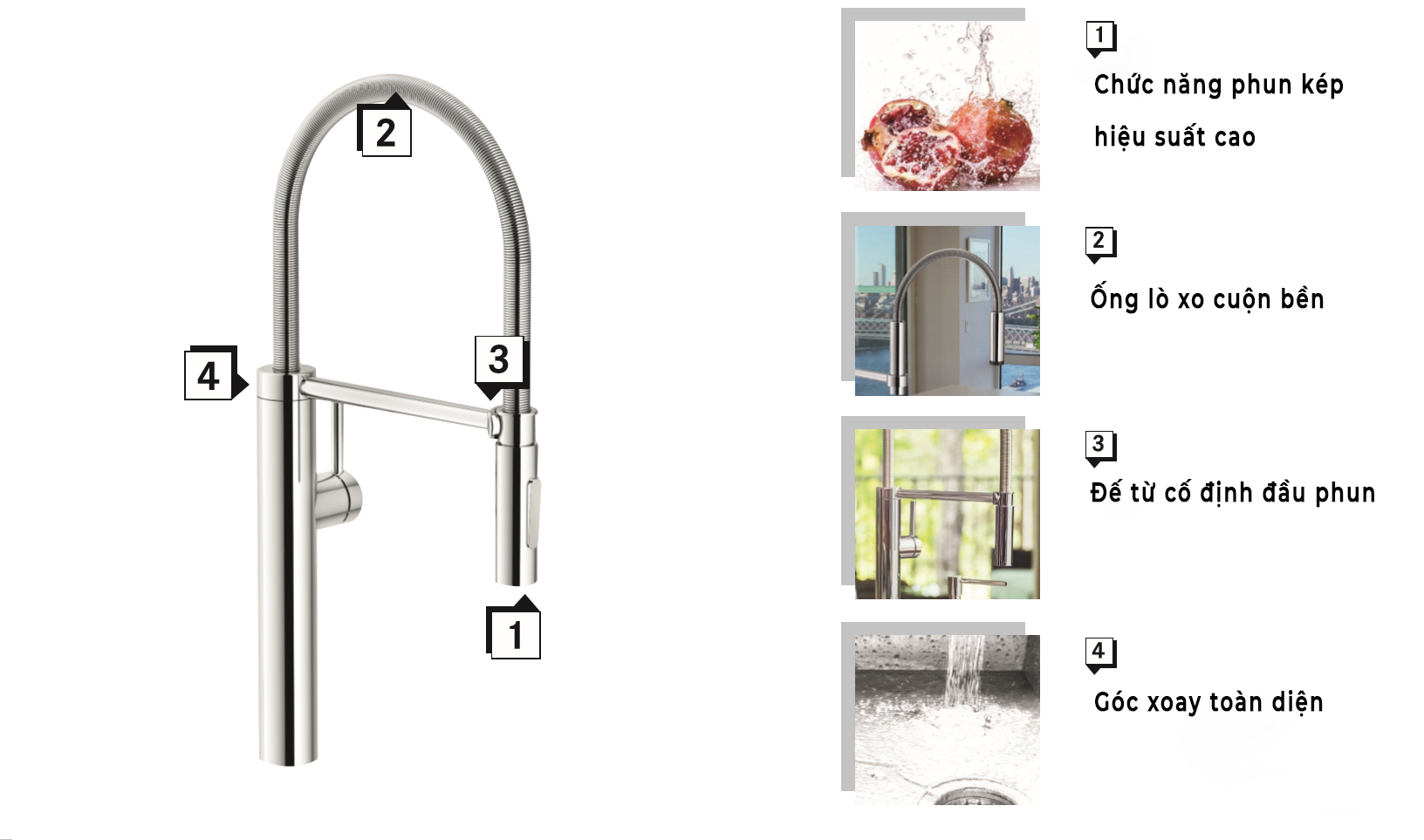 – Được thiết kế đường cong tuyệt mỹ với dây di động xoay tròn cho phép bạn định vị và giữ được dòng nước chảy tại vị trí mong muốn, sản phẩm là điểm nhấn ấn tượng trong nhà bếp cho bất kì phong cách thiết kế nội thất nào.